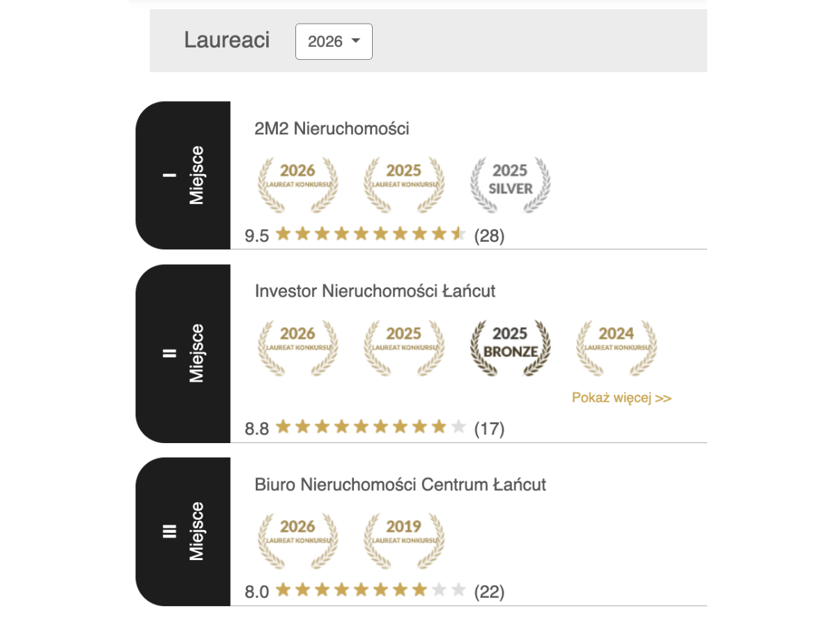 Z dumą ogłaszamy, że biuro 2M2 Nieruchomości po raz kolejny stanęło na najwyższym stopniu podium w prestiżowym plebiscycie Orły Nieruchomości. Z wynikiem 9.5/10 obroniliśmy tytuł lidera w Łańcucie, co jest dla nas najlepszym potwierdzeniem, że pasja i rzetelność zawsze popłacają.
